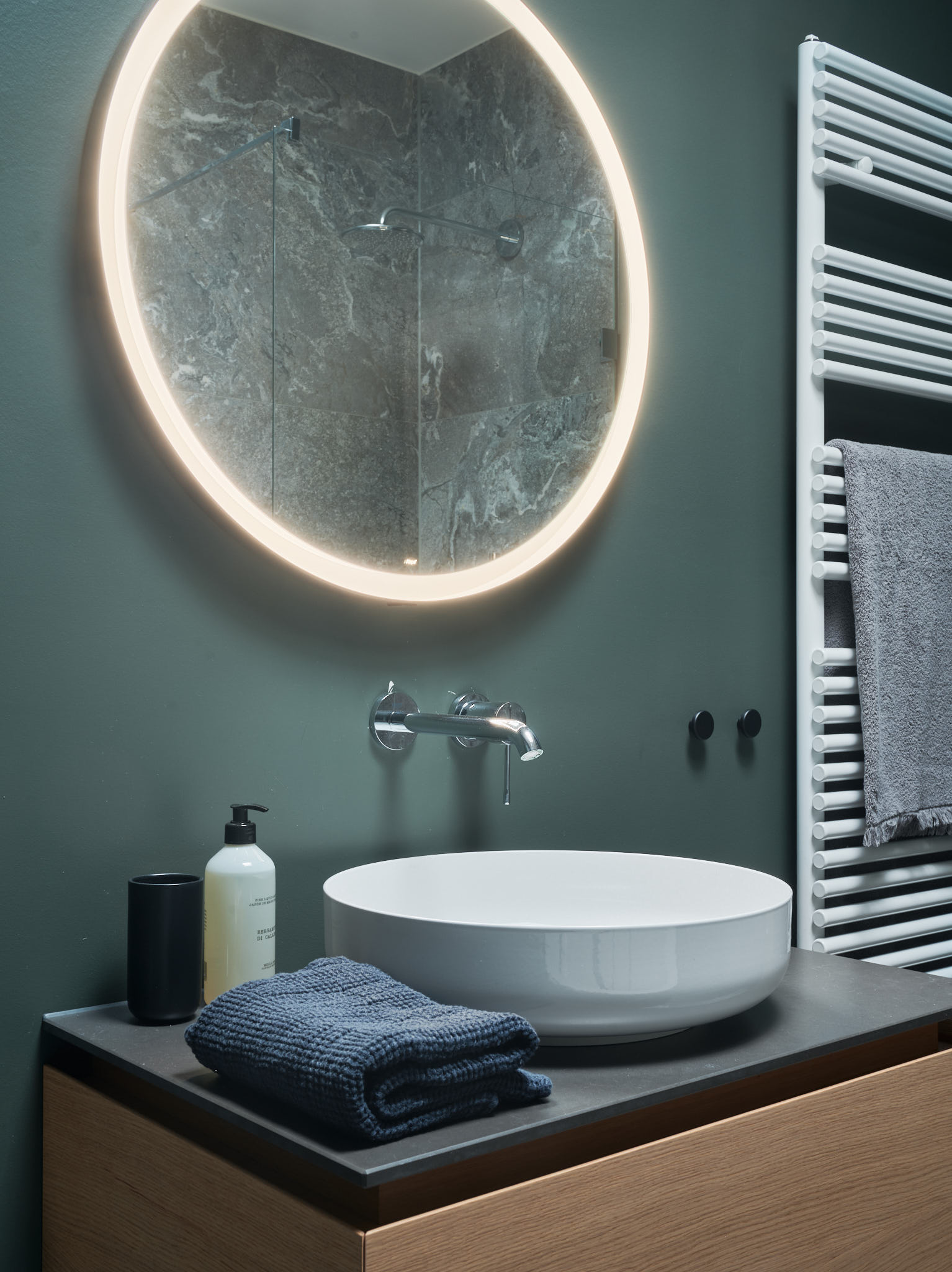 Das Bad ist mit bodengleicher Dusche und Badewanne, einem tageslichtspendenden Oberlicht und der Auswahl der Materialien und Farben ein komfortables/…. Statement auf kleinem Raum.Das Bad ist mit bodengleicher Dusche und Badewanne, einem tageslichtspendenden Oberlicht und der Auswahl der Materialien und Farben ein komfortables/…. Statement auf kleinem Raum.
